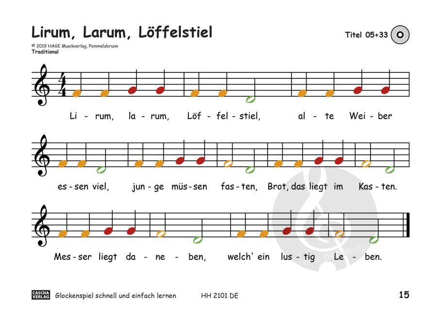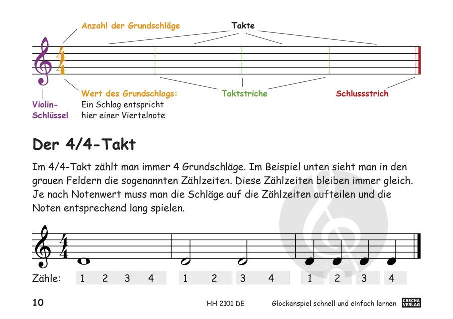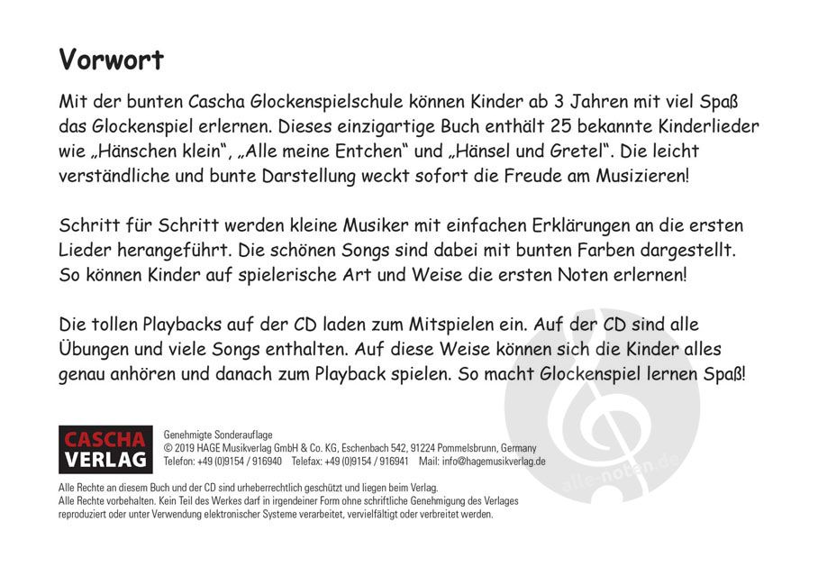 Mit der bunten Cascha Glockenspielschule können Kinder ab 3 Jahren mit viel Spaß das Glockenspiel erlernen. Dieses einzigartige Buch enthält 25 bekannte Kinderlieder wie 'Hänschen klein', 'Alle meine Entchen' und 'Hänsel und Gretel'. Die leicht verständliche und bunte Darstellung weckt sofort die Freude am Musizieren.