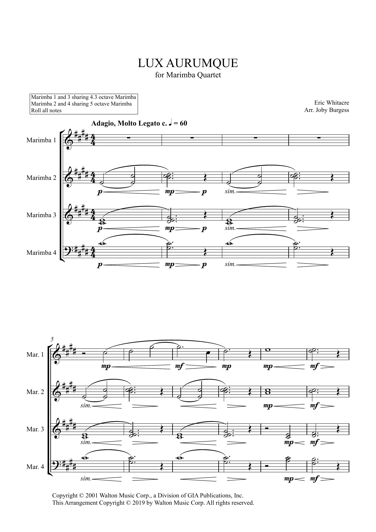 Lux Aurumque for Marimba Quartet