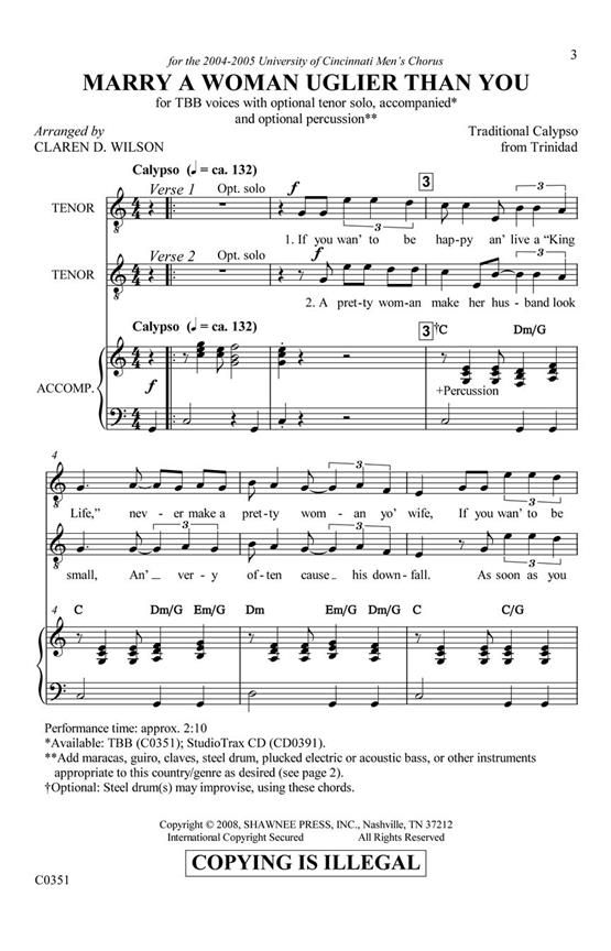 This Calypso tune from Trinidad will be a showstopper for your men. The text is hilarious with opportunities for solo voices and percussion instruments. This funny novel piece will make a nice multicu...