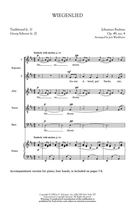 Arranged simply for mixed voices, clarinet and piano four-hands, the lovely Brahms cradle song becomes a work for reflection, healing and introspection, especially appropriate as a quiet encore or cho...