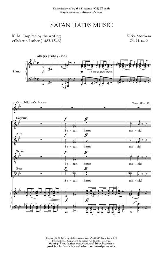 With lyrics by the composer broadly inspired by Martin Luther, Mechem has crafted a comical work in a neo-Baroque style. The optional children's choir (or adult sopranos and altos) sing Bach's melodie...