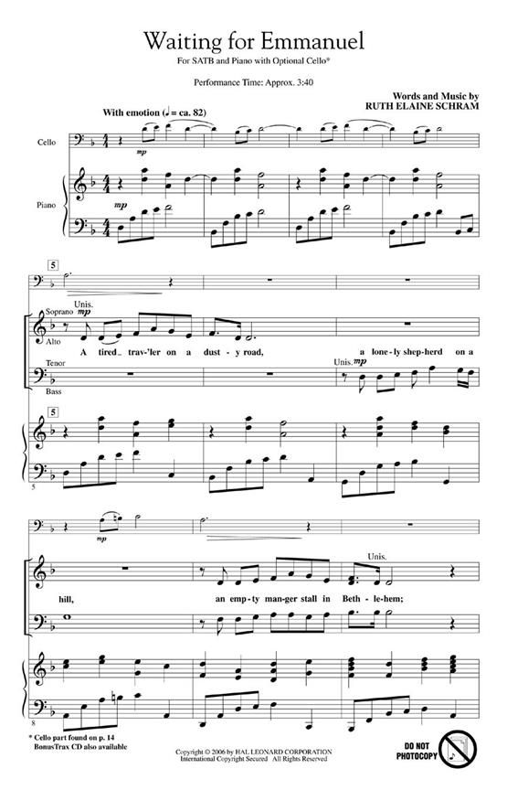 The plaintive melody and text surrounded by cello and piano, describe all who wait for the arrival of Emmanuel. Each with a need that only He could fill. An excellent choice for Advent and Christmas....