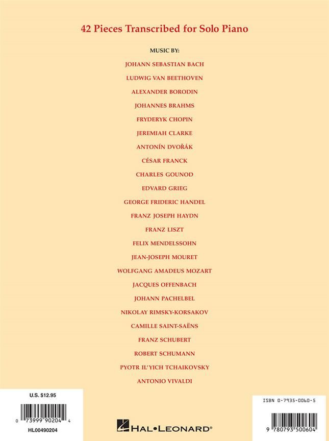 Delightful piano solo arrangements of beloved classical pieces, including: Air on the G String (Bach) - Für Elise (Beethoven) - Seguidilla from Carmen (Bizet) - Lullaby (Brahms) - Clair De Lune (Debus...