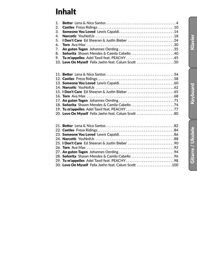 Für Keyboard sind alle Songs mit Melodielinie, Texten und Akkorden notiert. Zudem gibt es zu jedem Song alle Akkorde in den richtigen Umkehrungen als übersichtliche Griffbilder.