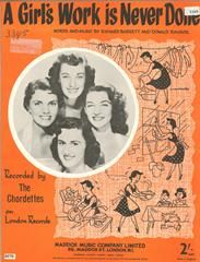 A Girl's Work Is Never Done, written by Richard Barrett and Donald Raysor, as performed by The Chordettes, arranged for voice and piano with guitar chords.