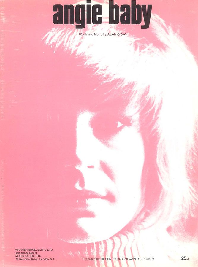 Angie Baby, written by Alan O'Day, as performed by Helen Reddy and arranged for voice and piano with guitar chords.