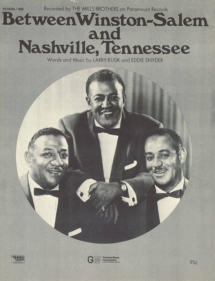 Between Winston-Salem And Nashville, Tennessee, written by Larry Kusik and Eddie Snyder, as recorded by The Mills Brothers and arranged for voice and piano with guitar chords.
