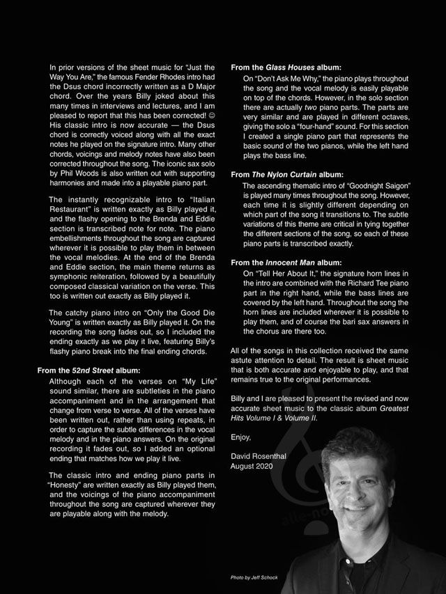 Billy Joel's keyboardist and musical director David Rosenthal has carefully arranged all the tracks from the Piano Man's iconic Greatest Hits Volume I & II, combining the piano parts and vocal melodies into playable arrangements with accurate transcriptions of those classic piano parts that are integral to each song. All 26 hit songs from the double album are in this collection, including: Allentown · Big Shot · The Entertainer · Honesty · It's Still Rock and Roll to Me · Just the Way You Are · The Longest Time · Movin' Out (Anthony's Song) · New York State of Mind · Only the Good Die Young · Piano Man · She's Always a Woman · Tell Her About It · Uptown Girl · You May Be Right · and more. This souvenir folio also includes a foreword by Rosenthal plus great photos of Billy.