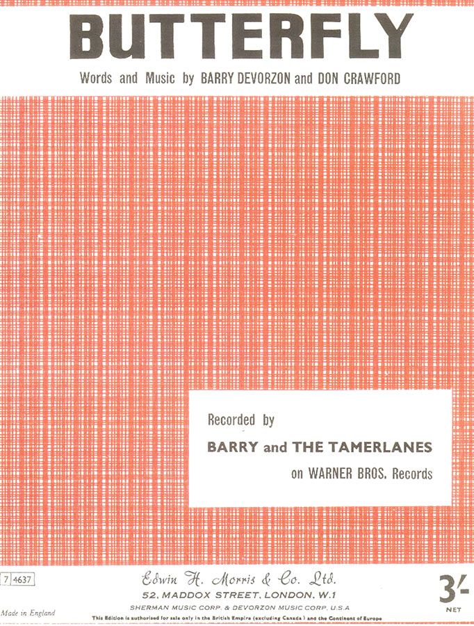Butterfly, written by Barry De Vorzon and Don Crawford, as recorded by Barry & The Tamerlanes and arranged for piano, voice and guitar.