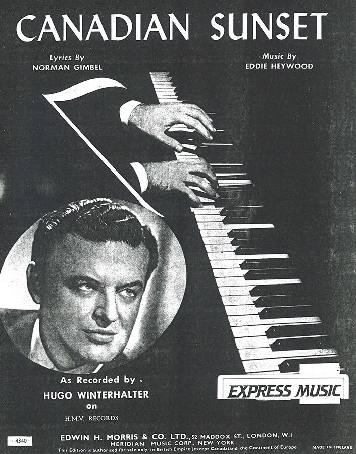 Canadian Sunset, written by Eddie Heywood with words by Norman Gimbel, as performed by Hugo Winterhalter, arranged for voice and piano with guitar chords.