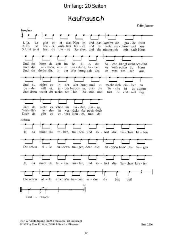 10 tierische RAPS für Kids ab 9 Jahren. Buch mit CD (Voll-Playback zum Mit-Rappen und Halb-Playback zum Selber-Rappen). Ausgezeichnet mit dem Medienpreis 'Leopold'(Verband deutscher Musikschulen: 'Gute Musik für Kinder'). Vorwort: Das 'Rappen' hat sich inzwischen als eine der wichtigsten Popmusik-Formen der 80er und 90er Jahre herauskristallisiert. Bisher war es für Lehrer schwierig, 'echte' Raptexte in den Unterricht zu integrieren, weil sie oft in schwer verständlichem Slang und/oder sexistisch und gewaltverherrlichend sind, so dass sie für einen unterrichtlichen Einsatz nicht in Frage kommen. Ausserdem ergibt sich das auch aus anderen Popstilen bekannte Problem der Fan-Gruppen-Polarisierung innerhalb der Klassengemeinschaft. Das Rap-Huhn - 10 tierische Raps umgeht dieses Problem durch speziell auf den Unterricht ab Klasse 9 zugeschnittenen Texte, ohne dabei auf wichtige Elemente des Rappens zu verzichten: umgangssprachlicher Ton, Alltags-Themen und ein gewisser lakonischer Humor.Besondere Vorteile für den Einsatz sind:Strophische Vertonung: Die Rhythmen für die Strophen bleiben gleich, was normalerweise bei Raps in dieser strengen Form nicht üblich ist, und erleichtert somit das Erfassen des Rhythmus.Übersichtliche Notation: Pro Doppelseite wird ein vollständiges Stück vorgestellt. Die auftaktige Notation erleichtert das Erfassen einer Textzeile, die sonst durch volltaktige Notation auseinandergerissen würde. Texte über allgemeine Themen: Die hier vorgestellten Texte behandeln Themen aus der Lebenswelt der Schüler und Lehrer, ohne mit einer falsch verstandenen Betroffenheit zu nahe zu treten. So können diese Raps weitgehend unabhängig von Geschlecht, Schultyp oder Klassenstufe eingesetzt werden.Playbacks zum Mitrappen: Neben dem 'Nach-Rappen' setzt die Möglichkeit, mit einem Playback zu arbeiten, auch erfahrungsgemäss die Kreativität frei: Eigene Rap-Texte entstehen auf Grundlage der vorgegebenen Playbacks. Auch der Einsatz von Instrumenten mit rhythmischer oder solistischer Funktion ist denkbar. Für diesen Fall würden die solistischen Passagen auf den Playbacks ausgespart.Wie bei Original-Raps empfiehlt sich auch in der Schule die Aufteilung des Sprechtextes in verschiedene Einzelsprecher/Sprechgruppen, wobei eine Vielzahl von Kombinationen möglich ist. Auf der beiliegenden CD werden einige Varianten vorgestellt. Ausserdem bietet sich mit dem Rappen auch die Möglichkeit des fächerübergreifenden Unterrichts, z.B. durch Kombination von Musik- mit Deutsch- (Sprachrhythmus), Kunst- (Graffiti) und Sportunterricht (Break- oder Popdance). Zur Vorbereitung kann man mit den Schülern klassische oder aktuelle Raps durchnehmen und dabei auf Textinhalt, Rap-Stil, Silbenrhythmus, Sprechweise und formalen Aufbau achten. In diesem Zusammenhang sollte man sich Zeit für einen Klassiker des Raps nehmen: 'The Message' von Grandmasters Flash and the Furious Five. Hier wird mit starker Sprache und eindringlichen, realistischen Bildern die Situation amerikanischer Schwarzer im grossstädtischen Ghetto beschrieben. Der Rap, das Wort, ist hier Waffe im Kampf gegen Ohnmacht, Armut und soziale Missstände: der Rapper wird zum Wortführer und Vorbild für die jugendlichen im Ghetto. So ist oder war der Rap (in Kombination mit Tanz und 'Graffitis') genau wie Blues oder Reggae zunächst eine Musik von 'ganz unten', die aber bald durch die internationale Pop-Verwertung für alles und jedes benutzt wurde. Die weltweite Verbreitung des Rappens hat neben der kommerziellen Verflachung jedoch auch neue kreative Impulse für die regionale Pop-Musik gebracht: ob hochdeutsch ('Fantastische Vier') oder Kölsch ('Arsch huh, Zäng ussenander'), ob italienisch ('Jovanotti') oder französisch ('MC Solar'), überall können durch das Rappen eigene Belange zum Ausdruck und an die Öffentlichkeit gebracht werden. Die augenblickliche beste Darstellung der Rap-Szene und CD-Hinweise finden sich in 'Rap Attack' von David Toop, München 1994. Viel Spass beim Rappen!