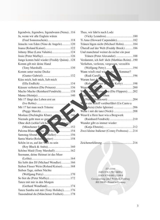 Das fünfte Songbook in der Reihe Liederbücher für Alt und Jung ist ein wahres Schlagerparadies für alle Fans des populären Musikgenres. Mit 100 beliebten und bekannten Songs aus den letzten 60 Jahren beinhaltet das Buch viele Perlen der deutschen Unterhaltungsmusik. Von Schön ist es auf der Welt zu sein von Roy Black & Anita über Du von Peter Maffay, Ein bisschen Frieden (Nicole) und Joana von Roland Kaiser bis hin zu Sie liebt den DJ von Michael Wendler gibt es hier viele der größten Songs aus der 'Hitparade', vom Ballermann und Schlagermove - alle speziell zum Mitsingen arrangiert und leicht zu begleiten mit der Gitarre. Wie beim beliebten Fetenbuch sind die benötigten Akkordgriffe sowie Schlagmuster für die Begleitung allen Songs vorangestellt. Viele Titel enthalten auch passende Zupfmuster. Eine Playlist mit allen Songs gibt es bei Spotify (100 Schlagerhits für Alt und Jung). Aus dem Inhalt: Atemlos durch die Nacht (Helene Fischer), Auf der Straße nach Süden (Tony Marshall), Die Hände zum Himmel (Chris Rabatz & The Kingz), So bist du (Peter Maffay), Hör gut zu (PUR), Ich will Spaß (Marcus), Junge, komm' bald wieder (Freddy Quinn), Sieben Fässer Wein (Roland Kaiser), Tausendmal du (Münchener Freiheit), Ti Amo (Howard Carpendale), Weiße Rosen aus Athen (Nana Mouskouri), 1000 und eine Nacht (Klaus Lage Band) u. v. m. Unter dem gleichen Titel ist auch ein Songbook für Ukulele erschienen.