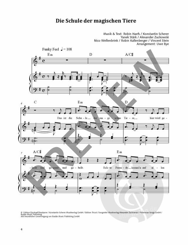 Endlich geht’s weiter: Die Schule der magischen Tiere 4 bringt ein brandneues Abenteuer voller Musik, Magie und Freundschaft auf die Kinoleinwand – und das passende Songbook liefert alle Lieder zum Mitsingen und Mitspielen! Idas Freundin Miriam kommt für drei Monate zurück, doch ein Geheimnis stellt ihre Freundschaft auf die Probe. Miriam erhält den frechen Koboldmaki Fitzgeraldo, Max entwickelt Gefühle für seine beste Freundin Leonie und erhält dafür Unterstützung von seiner Eule Muriel. Als plötzlich der Verkauf der Schule droht, gerät die magische Gemeinschaft ins Wanken. Können die Schüler mit der großen Schulchallenge alles retten? Alle Songs des Films liegen in kindgerechten Arrangements für Gesang, Sopranblockflöte und leicht gesetztes Klavier vor. Die Gesangsstimme kann auch auf der Flöte gespielt werden; das Klavier eignet sich zur Begleitung oder zum Solovortrag. Ein musikalisches Highlight für Zuhause, die Schule oder den ersten Auftritt!