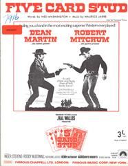 Five Card Stud, written by Maurice Jarre with words by Ned Washington, as performed by Dean Martin from the Paramount Picture '5 Card Stud', arranged for voice and piano with guitar chords.