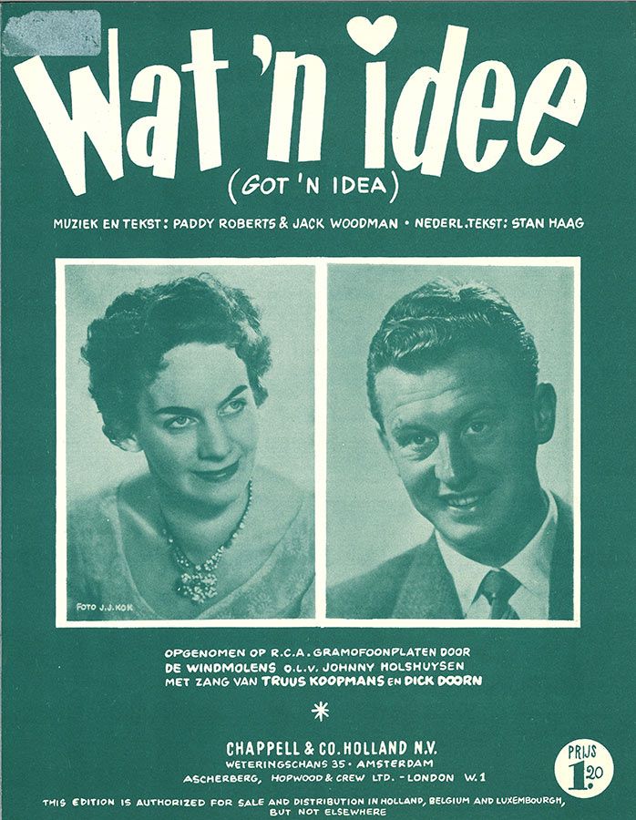 Got'N Idea (You Don't Love Me Any More), written by Paddy Roberts and Jack Woodman, as performed by Paddy Roberts and Alma Cogan, includes Dutch text arranged by Stan Haag, arranged for voice and piano with guitar chords.