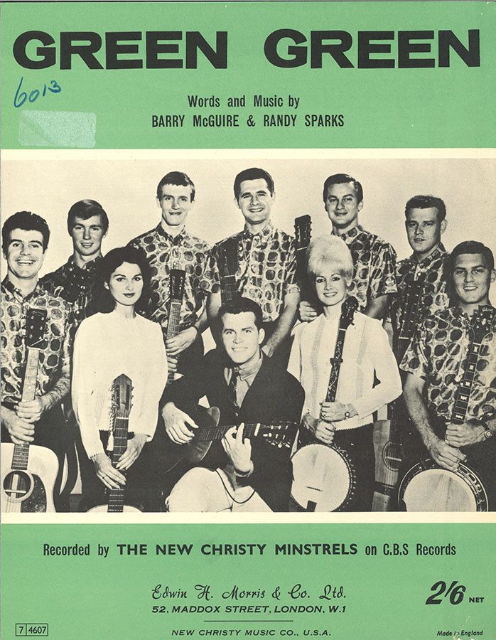 Green Green, written by Barry McGuire and Randy Sparks, as performed by The New Christy Minstrels, arranged for voice and piano with guitar chords.