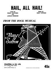 Hail, All Hail composed by Enzo Toppano with words by Peggy Mortimer and Lorrae Desmond from the Rock Musical Man Of Sorrow in the key of Bb Major arranged for voice, piano and guitar.