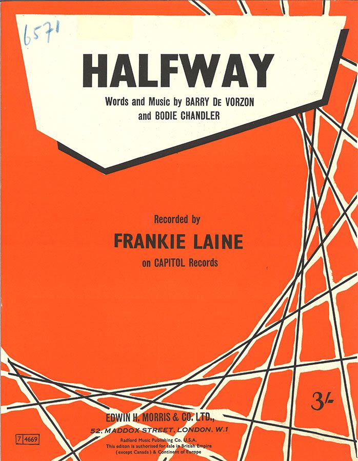 Halfway, written by Barry De Vorzon and Bodie Chandler, as performed by Frankie Laine, arranged for voice and piano with guitar chords.
