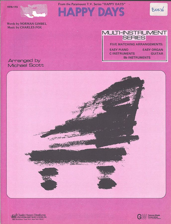 Happy Days written by Charles Fox with words by Norman Gimbel arranged for voice and piano with guitar chords.