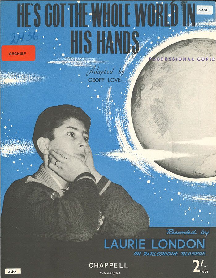 He's Got The Whole World In His Hands, traditional words and music adapted by Geoff Love, as performed by Laurie London, arranged for voice and piano with guitar chords.