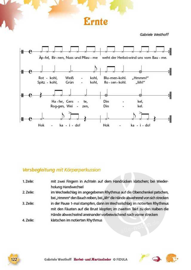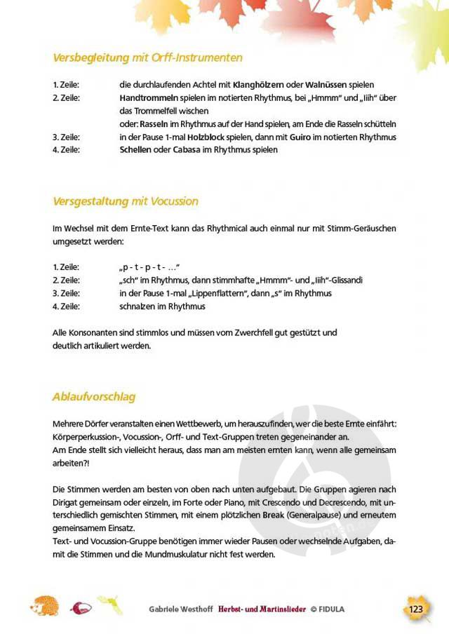 Die Auswahl der hier vorliegenden 117 Herbst-, Laternen- und Martinslieder berücksichtigt altes und neues Liedgut, Lieder aus verschiedenen Ländern mit fremdsprachigen Texten, Lieder in unterschiedlichen Ton- und Taktarten, Kanons und Lieder mit leichter Zweistimmigkeit. Darüber hinaus ergänzen Sprechverse, Fingerspiele, Rhythmicals und Stimmgeschichten die Sammlung.