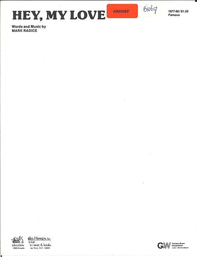 Hey, My Love, written by Mark Radice, as recorded by Dion, arranged for voice and piano with guitar chords.