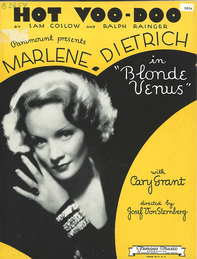 Hot Voodoo, written by Ralph Rainger with words by Sam Coslow, as introduced by Marlene Dietrich in the Paramount Picture 'The Blonde Venus', arranged for voice and piano with guitar chords.
