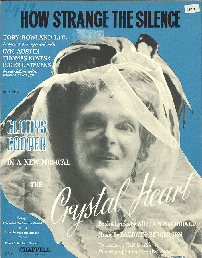 How Strange The Silence, written by Baldwin Bergersen with words by William Archibald, as performed by Gladys Cooper from the musical 'The Crystal Heart', arranged for voice and piano with guitar chords.