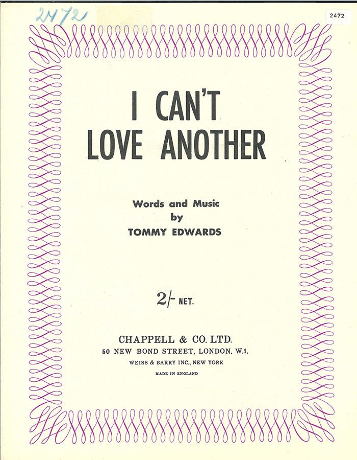 I Can't Love Another, written by Tommy Edwards, arranged for voice and piano with guitar chords.