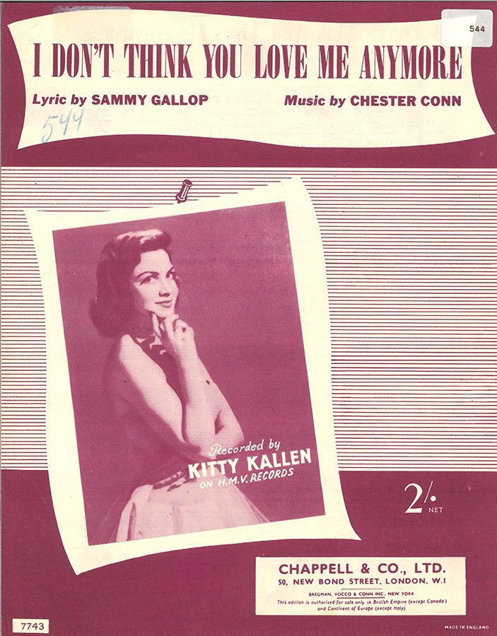 I Don't Think You Love Me Anymore, written by Chester Conn with words by Sammy Gallop, as recorded by Kitty Kallen, arranged for voice and piano with guitar chords.
