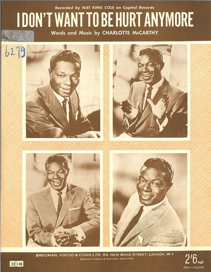 I Don't Want To Be Hurt Anymore, written by Charlotte McCarthy, as recorded by Nat King Cole, arranged for voice and piano with guitar chords.