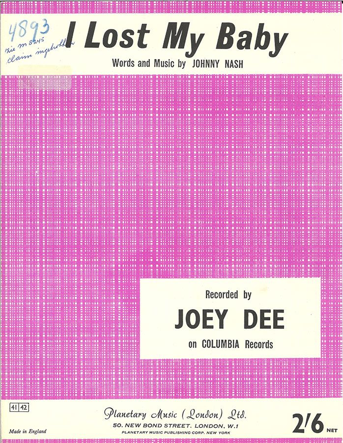 I Lost My Baby, written by Johnny Nash, as recorded by Joey Dee, arranged for voice and piano with guitar chords.