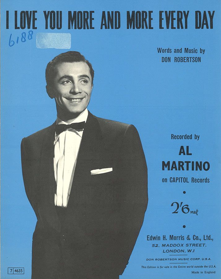 I Love You More And More Each Day, written by Don Robertson, as recorded by Al Martino, arranged for voice and piano with guitar chords.