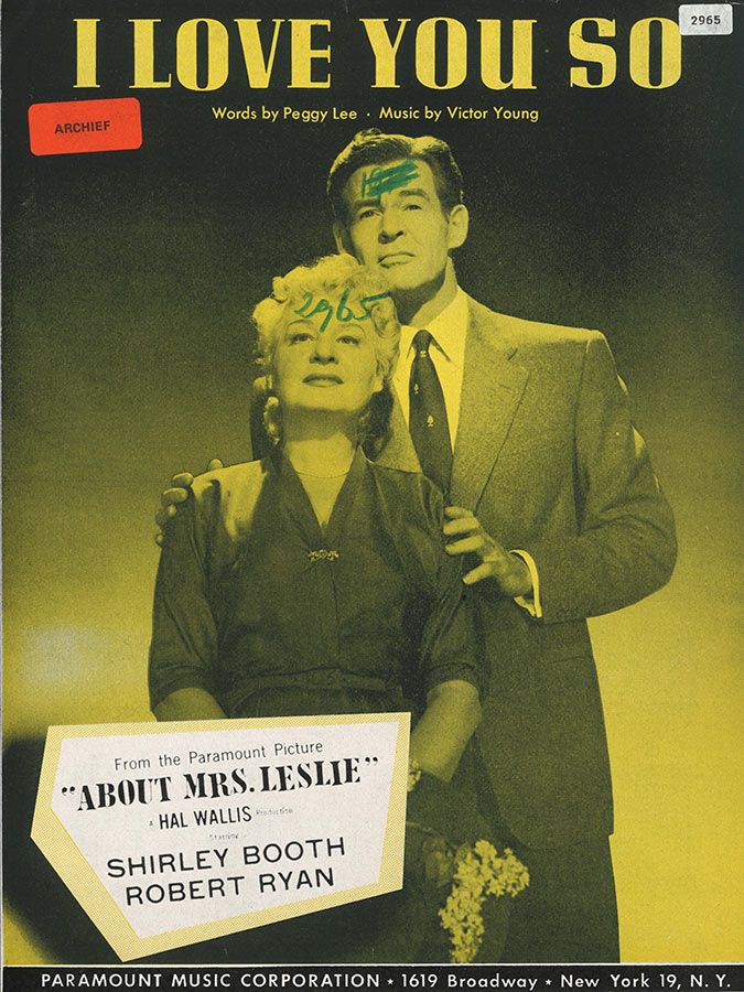 I Love You So, written by Victor Young with words by Peggy Lee, from the Paramount Picture 'About Mrs Leslie', as performed by Shirley Booth, arranged for voice and piano with guitar chords.