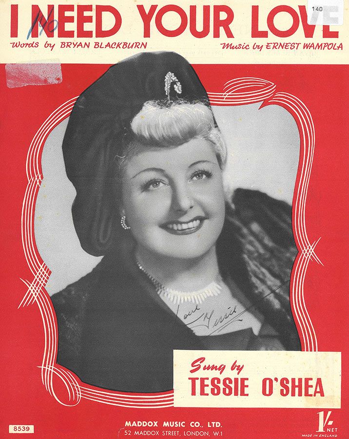 I Need Your Love, written by Ernest Wampola with words by Bryan Blackburn, as recorded by Tessie O'Shea and arranged for voice and piano with guitar chords.