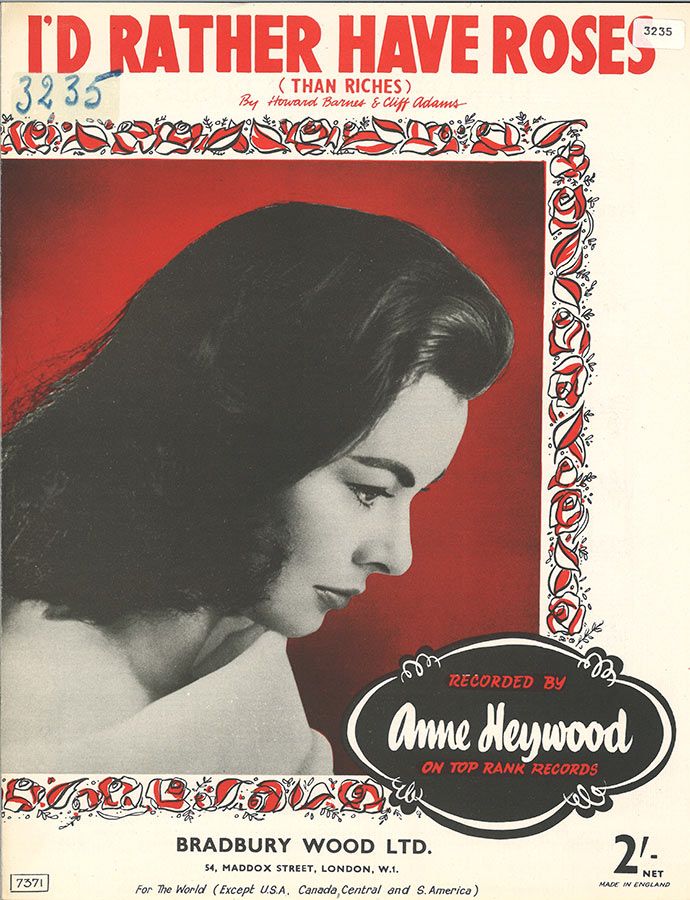 I'd Rather Have Roses (Than Riches), as recorded by Anne Heywood, arranged for voice and piano with guitar chords.