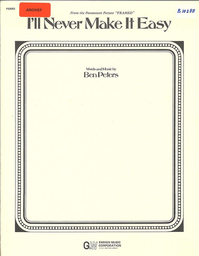 I'll Never Make It Easy, written by Ben Peters, from the Paramount Picture 'Framed', arranged for voice and piano with guitar chords.