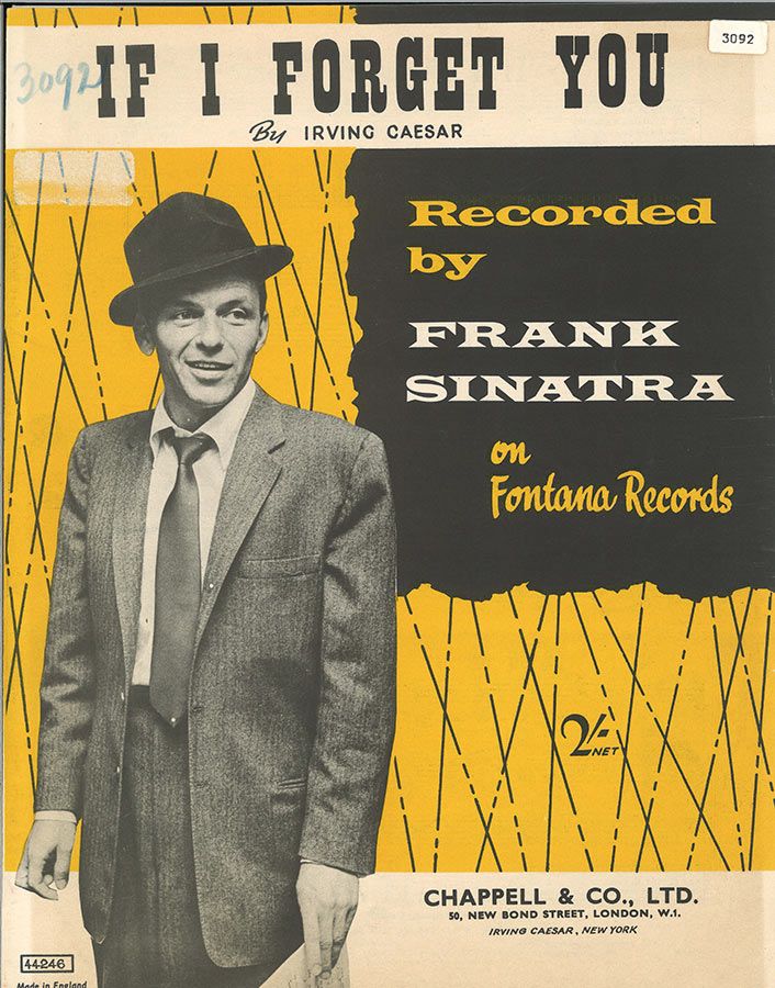 If I Forget You, written by Irving Caesar, as recorded by Frank Sinatra, arranged for voice and piano with guitar chords.