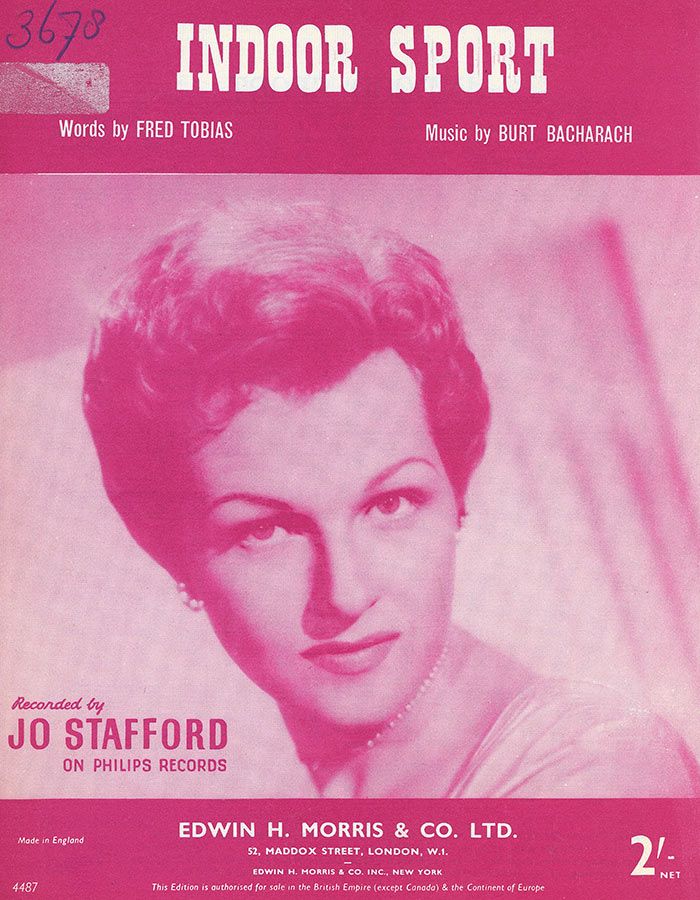 Indoor Sport, written by Burt Bacharach with words by Fred Tobias, as performed by Jo Stafford, arranged for voice and piano with guitar chords.