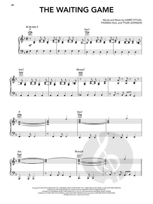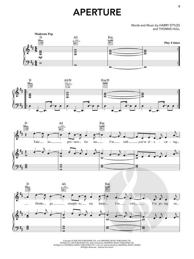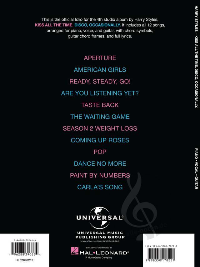 Jetzt können Sie das gesamte Album mit unserem passenden Songbook am Klavier erleben! "Harry Styles - Kiss All the Time. Disco, Occasionally." enthält alle 12 Songs von Harrys viertem Studioalbum, arrangiert für Klavier, Gesang und Gitarre, komplett mit vollständigen Texten, Akkordsymbolen und Gitarrenakkordrahmen. Egal, ob du die eingängigen Hooks spielst, dich in die stimmungsvolleren Momente vertiefst oder deine eigene Interpretation hinzufügst, diese Arrangements bringen den Sound und die Persönlichkeit des Albums direkt auf deine Fingerspitzen!