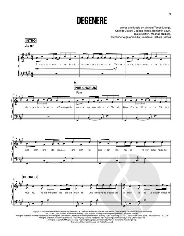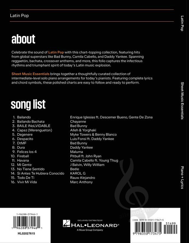 Feiern Sie den Sound des Latin-Pop mit dieser Sammlung, die Hits von globalen Superstars wie Bad Bunny, Camila Cabello und Daddy Yankee enthält. Mit Reggaetón, Bachata, Crossover-Hymnen und mehr fängt dieses Folio die ansteckenden Rhythmen und den triumphalen Geist der heutigen Latin-Musik-Explosion ein.
