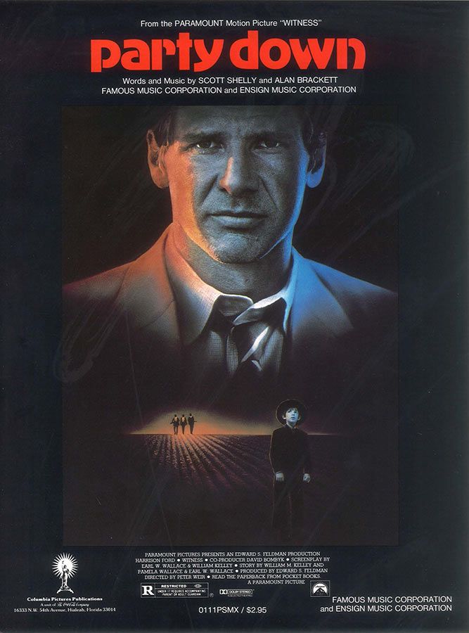 Party Down, written by Scott Shelly and Aland Brackett, from the Paramount picture 'Witness', arranged for voice and piano with guitar chords.
