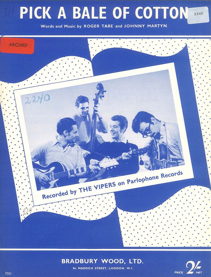 The traditional song Pick A Bale Of Cotton, arranged by Johnny Martyn and Roger Tare, as performed by The Vipers, arranged for voice and piano with guitar chords.