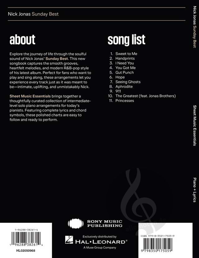 Spielen Sie den gefühlvollen Sound von Nick Jonas' "Sunday Best" mit diesem passenden Songbook. Es enthält ausdrucksstarke Klavierarrangements aller 11 Titel mit vollständigen Texten und Akkordsymbolen, die die sanften Grooves, die gefühlvollen Melodien und den modernen R&B-Pop-Stil des Albums einfangen. Perfekt für Fans, die mitspielen und mitsingen wollen. Diese Arrangements lassen Sie jeden Titel so erleben, wie er gehört werden sollte–intim, erhebend und unverwechselbar Nick.