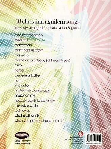 This is a fabulous compilation of the best of Christina Aguilera! Includes the hit Ain't No Other Man from her Back To Basics album, along with the smash hits, Beautiful, Dirrty, Fighter and her debut, Genie In A Bottle. All songs are arranged for piano, voice, and guitar, so you can sing and play them yourself!