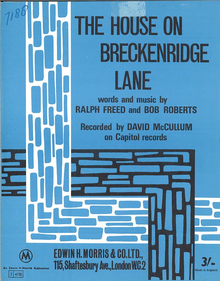 The House On Breckenridge Lane, written by Ralph Freed and Bob Roberts, as recorded by David McCullum, arranged for voice and piano with guitar chords.