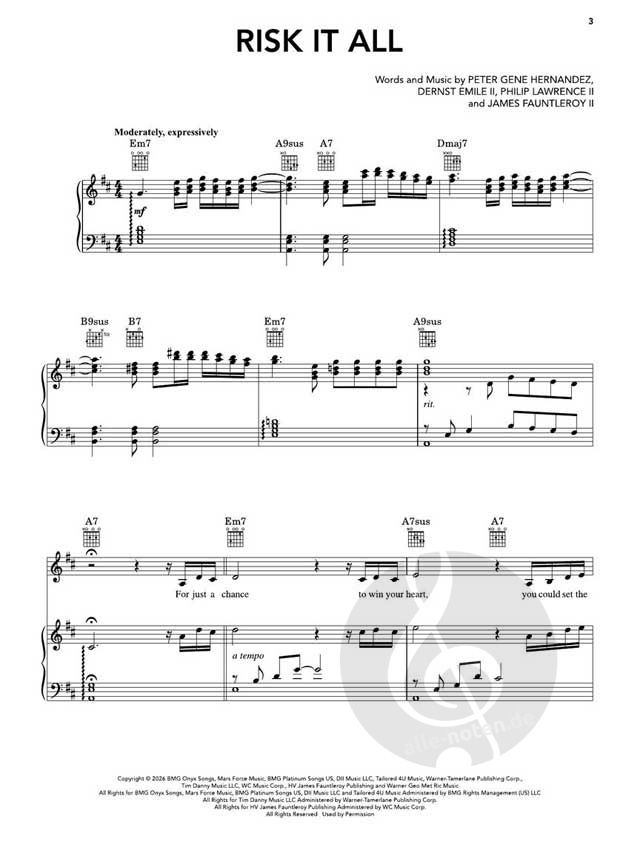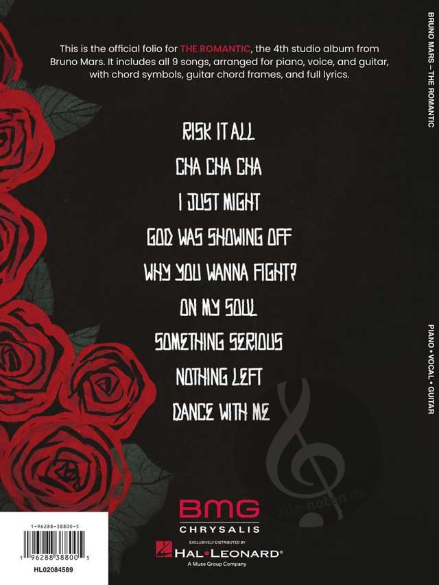 Unser passendes "Bruno Mars - The Romantic" Songbook lässt Sie all das selbst erleben! Diese Sammlung für Klavier, Gesang und Gitarre enthält alle neun Songs des Albums, inklusive Arrangements mit Texten, Akkordsymbolen und Gitarrenakkordrahmen. Perfekt für Interpreten und Fans gleichermaßen, macht es diese Sammlung einfach, in Brunos Welt einzutauchen und jeder Note ein wenig mehr Stil zu verleihen!