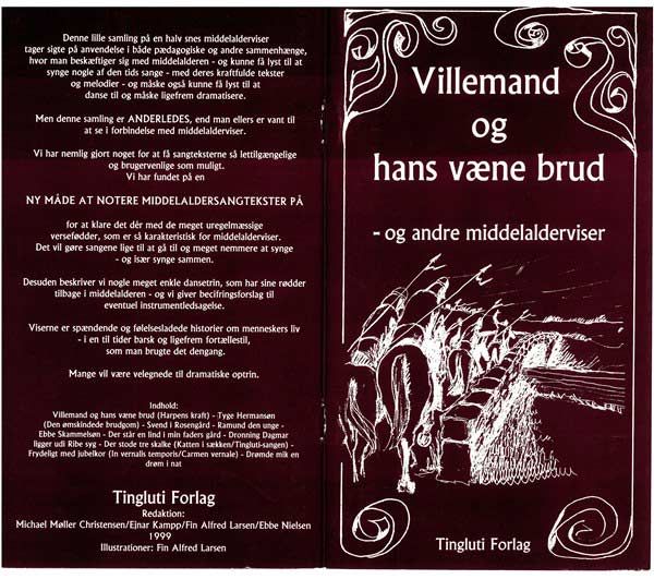 Villemand Og Hans Væne Brud - og andre middelalderviser - a collection of Danish songs from the Medieval period. Denne lille samling på en halv snes middelalderviser tager sigte på anvendelse både i pædagogiske og i andre sammenhænge, hvor man beskæftiger sig med middelalderen - og kunne få lyst til at synge nogle af den tids sange - måske også at danse til - og måske endda at dramatisere. Men denne samling er anderledes, end man ellers er vant til at se i forbindelse med middelalderviser. For at klare problemet med de ofte meget uregelmæssige versefodder, som er så karakteristisk for middelalderviser, introduceres her en ny måde at gengive middelaldersangtekster på. Det vil gore sangene lige til at gå til og meget nemmere at synge - især at synge sammen. Desuden beskrives der nogle meget enkle dansetrin, som har sine rodder tilbage i middelalderen, og der gives becifringsforslag til brug ved eventuel instrumentledsagelse. Indhold: Villemand Tyge Hermanson Svend i Rosengård Ramund Ebbe Skammelson Der står en lind Dronning Dagmar Der stod tre skalke Frydeligt med jubelkor Dromde mik en drom