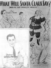 What Will Santa Claus Say? (Whe He Finds Everybody Swingin'), written and performed by Louis Prima, arranged for voice and piano with guitar chords.