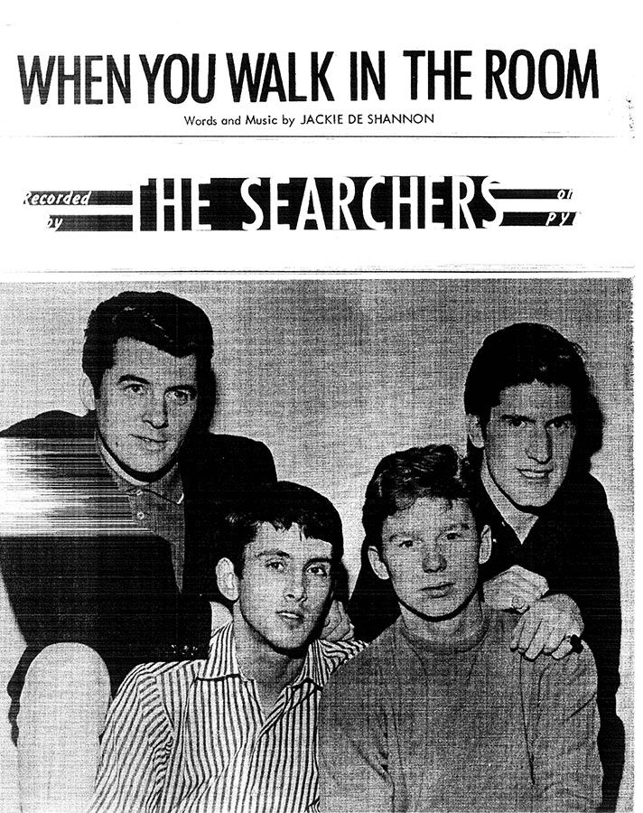 When You Walk In The Room, written by Jackie De Shannon, as recorded by The Searchers, arranged for voice and piano with guitar chords.